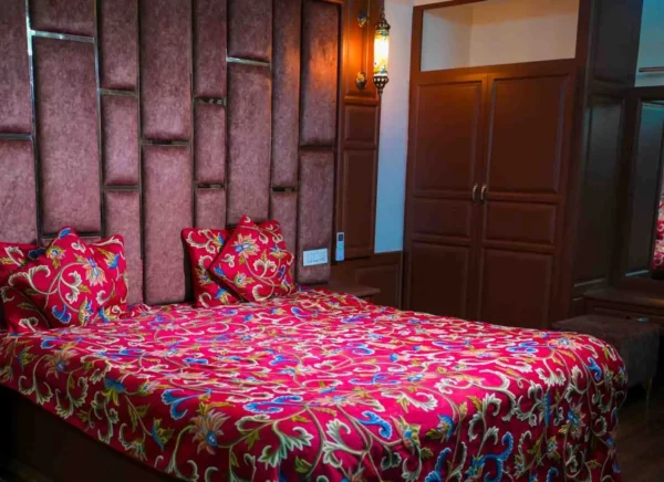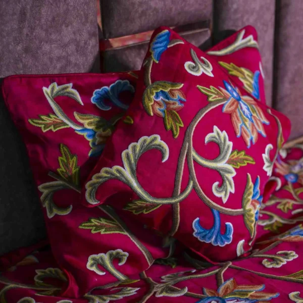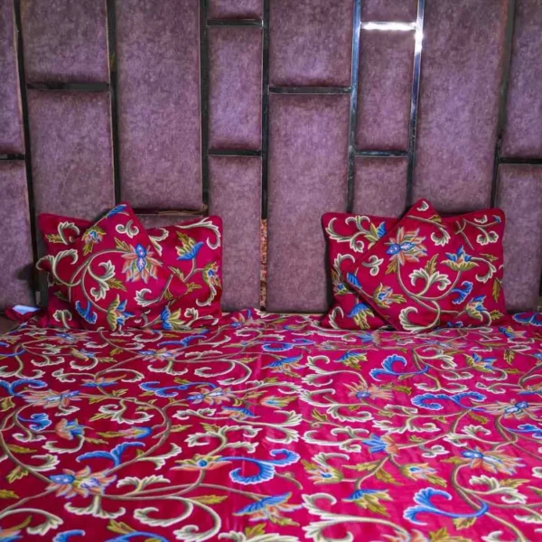 Add a touch of opulence to your space with this maroon silk organza bedcover set, featuring exquisite hand embroidery and heritage-inspired floral motifs. This 5-piece set includes a double bedcover, two pillow covers, and two cushion covers – perfect for elevating your decor with timeless elegance and artisanal charm.